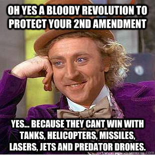 Oh yes a bloody revolution to protect your 2nd amendment Yes... Because they cant win with tanks, helicopters, missiles, lasers, jets and predator drones.
