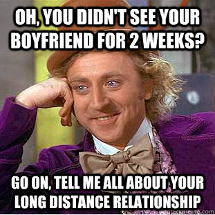 Oh, you didn't see your boyfriend for 2 weeks? go on, tell me all about your long distance relationship