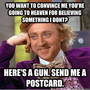 you want to convince me you're going to heaven for believing something i dont? here's a gun. send me a postcard.