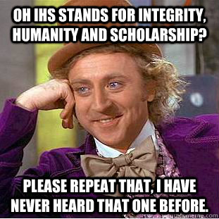 Oh IHS Stands for Integrity, Humanity and Scholarship? Please repeat that, I have never heard that one before.