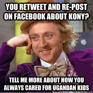 You retweet and re-post on Facebook about Kony? Tell me more about how you always cared for Ugandan kids