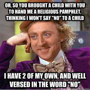 Oh, so you brought a child with you to hand me a religious pamphlet, thinking I won't say "No" to a child i have 2 of my own, and well versed in the word "No"
