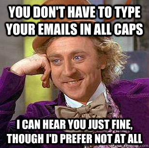 you don't have to type your emails in all caps i can hear you just fine, though i'd prefer not at all