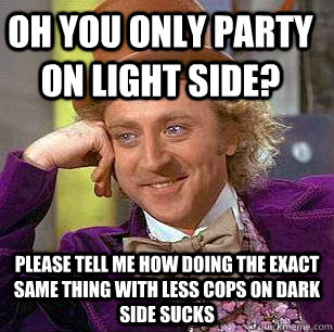 Oh you only party on light side? Please tell me how doing the exact same thing with less cops on dark side sucks