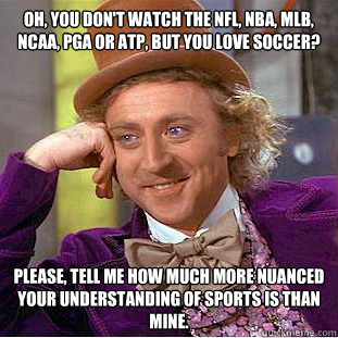 Oh, you don't watch the NFL, NBA, MLB, NCAA, PGA or ATP, but you love soccer? Please, tell me how much more nuanced your understanding of sports is than mine.