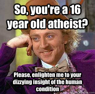 So, you're a 16 year old atheist? Please, enlighten me to your dizzying insight of the human condition