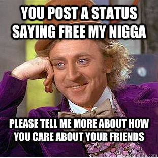 You post a status saying free my nigga please tell me more about how you care about your friends