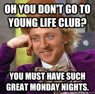 Oh you don't go to Young Life club? You must have such great Monday nights.