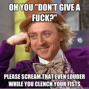 Oh you "don't give a fuck?" please scream that even louder while you clench your fists