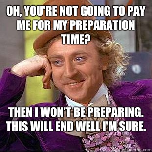 Oh, you're not going to pay me for my preparation time? Then I won't be preparing. This will end well I'm sure.