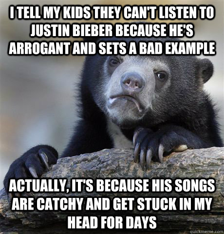 I tell my kids they can't listen to justin bieber because he's arrogant and sets a bad example actually, it's because his songs are catchy and get stuck in my head for days
