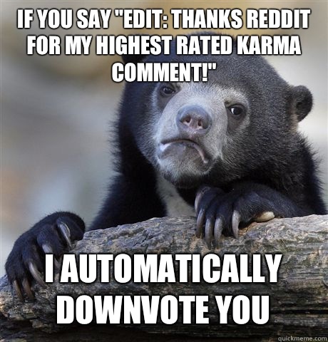 If you say "Edit: thanks reddit for my highest rated karma comment!" I automatically downvote you