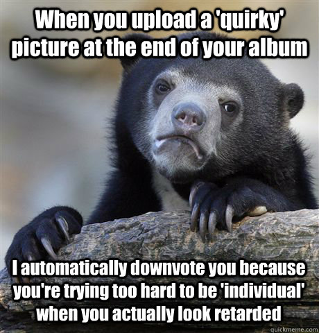 When you upload a 'quirky' picture at the end of your album I automatically downvote you because you're trying too hard to be 'individual' when you actually look retarded