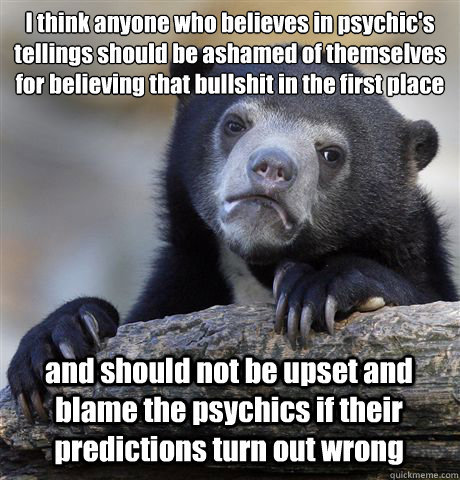 I think anyone who believes in psychic's tellings should be ashamed of themselves for believing that bullshit in the first place and should not be upset and blame the psychics if their predictions turn out wrong