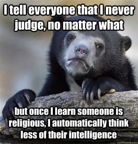 I tell everyone that I never judge, no matter what but once I learn someone is religious, I automatically think less of their intelligence