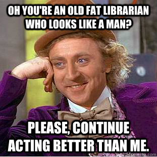 Oh you're an old fat librarian who looks like a man? Please, continue acting better than me.