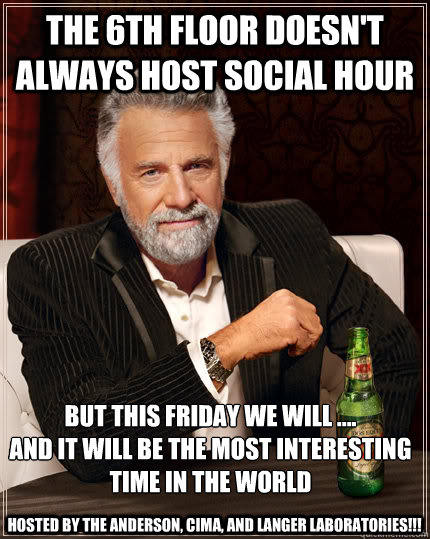 The 6th floor doesn't always host social hour But this Friday we will .... and it will be the most interesting time in the world Hosted by the Anderson, Cima, and Langer Laboratories!!!