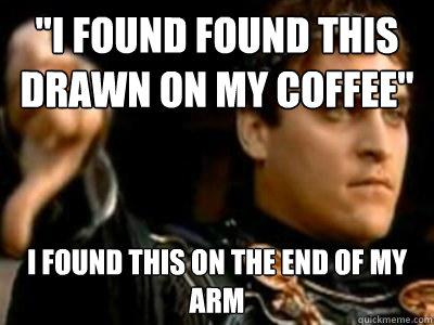 "I found found this drawn on my coffee" I found this on the end of my arm