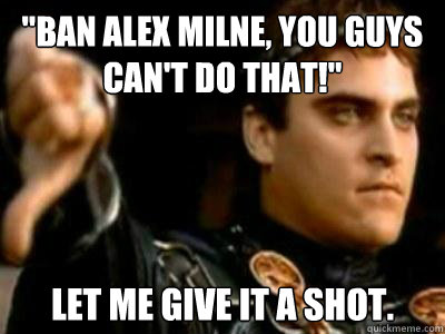 "Ban Alex Milne, you guys can't do that!" Let me give it a shot.