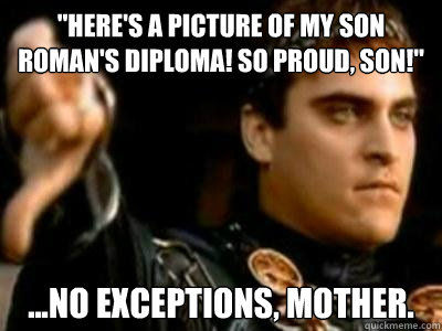 "Here's a picture of my son roman's diploma! So proud, son!" ...No exceptions, Mother.