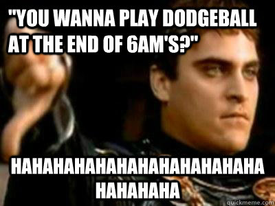 "You wanna play dodgeball at the end of 6am's?" HAHAHAHAHAHAHAHAHAHAHAHAHAHAHAHA