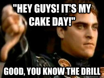 "Hey guys! it's my cake day!" Good, you know the drill