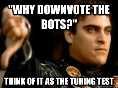 "Why downvote the bots?" Think of it as the turing test