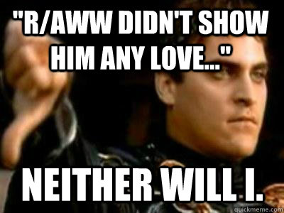 "r/aww didn't show him any love..." neither will I.
