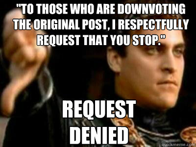 "To those who are downvoting the original post, I respectfully request that you stop." Request denied