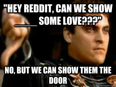 "Hey Reddit, can we show ____ some love???" No, but we can show them the door