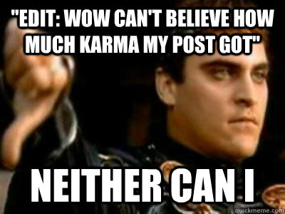 "EDIT: WOW CAN'T BELIEVE HOW MUCH KARMA my POST GOT" Neither can i