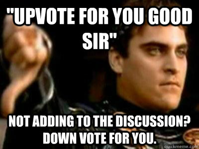 "Upvote for you good sir" Not adding to the discussion? Down vote for you.