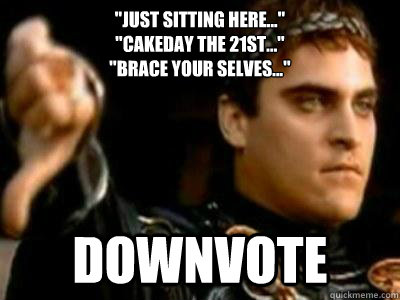"just sitting here..." "Cakeday the 21st..." "Brace your selves..." Downvote