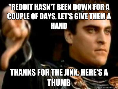 "reddit hasn't been down for a couple of days, let's give them a hand thanks for the jinx. here's a thumb