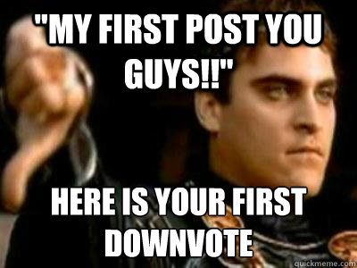 "my first post you guys!!" Here is your first downvote