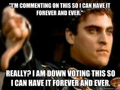 "I'm commenting on this so I can have it forever and ever." Really? I am down voting this so I can have it forever and ever.