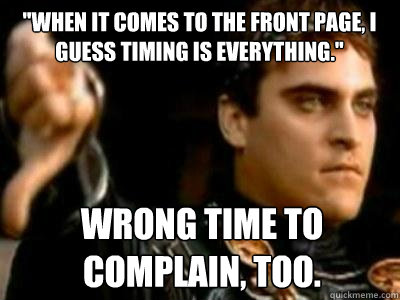 "When it comes to the front page, I guess timing is everything." Wrong time to complain, too.