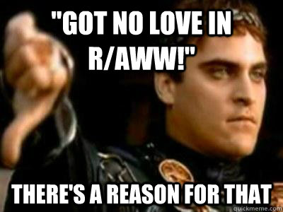 "Got no love in r/aww!" There's a reason for that
