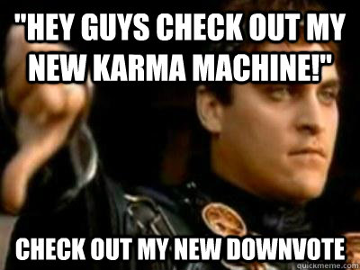 "Hey guys check out my new karma machine!" Check out my new downvote