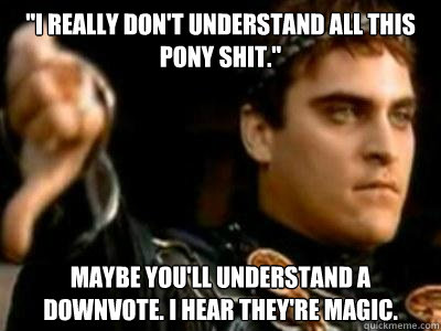 "I really don't understand all this pony shit." Maybe you'll understand a downvote. I hear they're magic.