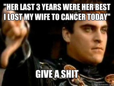 "Her last 3 years were her best I lost my wife to cancer today" Give a shit