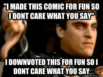 "I MADE THIS COMIC FOR FUN SO I DONT CARE WHAT YOU SAY" I DOWNVOTED THIS FOR FUN SO I DONT CARE WHAT YOU SAY