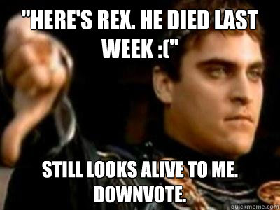 "Here's Rex. He died last week :(" still looks alive to me. downvote.