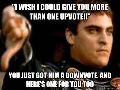 "i'll give you more than one upvote if i could" "I'll give you more than one downvote if i could"