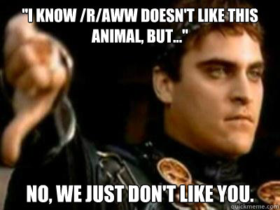 "I know /r/aww doesn't like this animal, but..." No, We just don't like you.