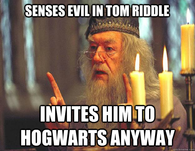 Senses evil in tom riddle Invites him to hogwarts anyway