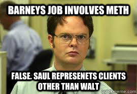 Barneys job involves meth FALSE. Saul represenets clients other than walt