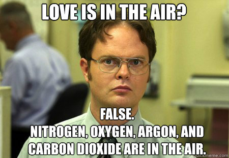 Love is in the air? False. Nitrogen, Oxygen, Argon, and Carbon Dioxide are in the air.