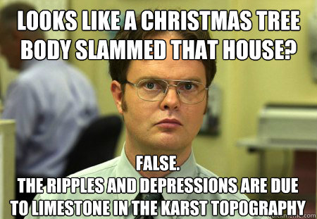 looks like a christmas tree body slammed that house? False. The ripples and depressions are due to limestone in the karst topography