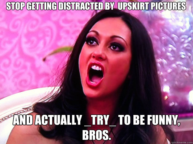 Stop getting distracted by upskirt pictures And actually _Try_ to be funny, Bros.